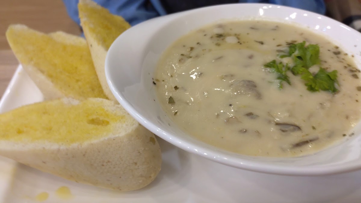 The coffee is good and the mushroom soup with mantou is delicious. The Portuguese egg tart is average. The eating area is clean and comfortable. Parking is challenging as this area is quite busy with many good eateries. Avoid coming during peak hour such as lunch time. The atmosphere could be better if there were light music played in the background.
